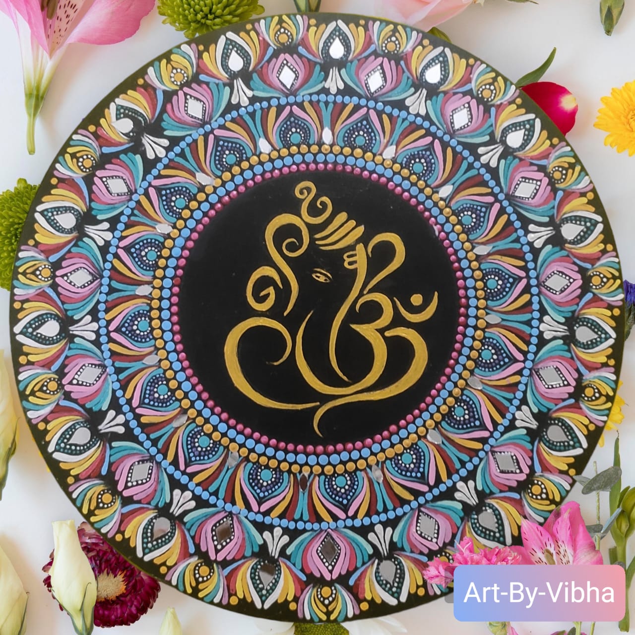 This handcrafted dot mandala painting features Lord Ganesha at its sacred center, surrounded by meticulously placed multicolour dot patterns that radiate balance, beauty, and spiritual energy.